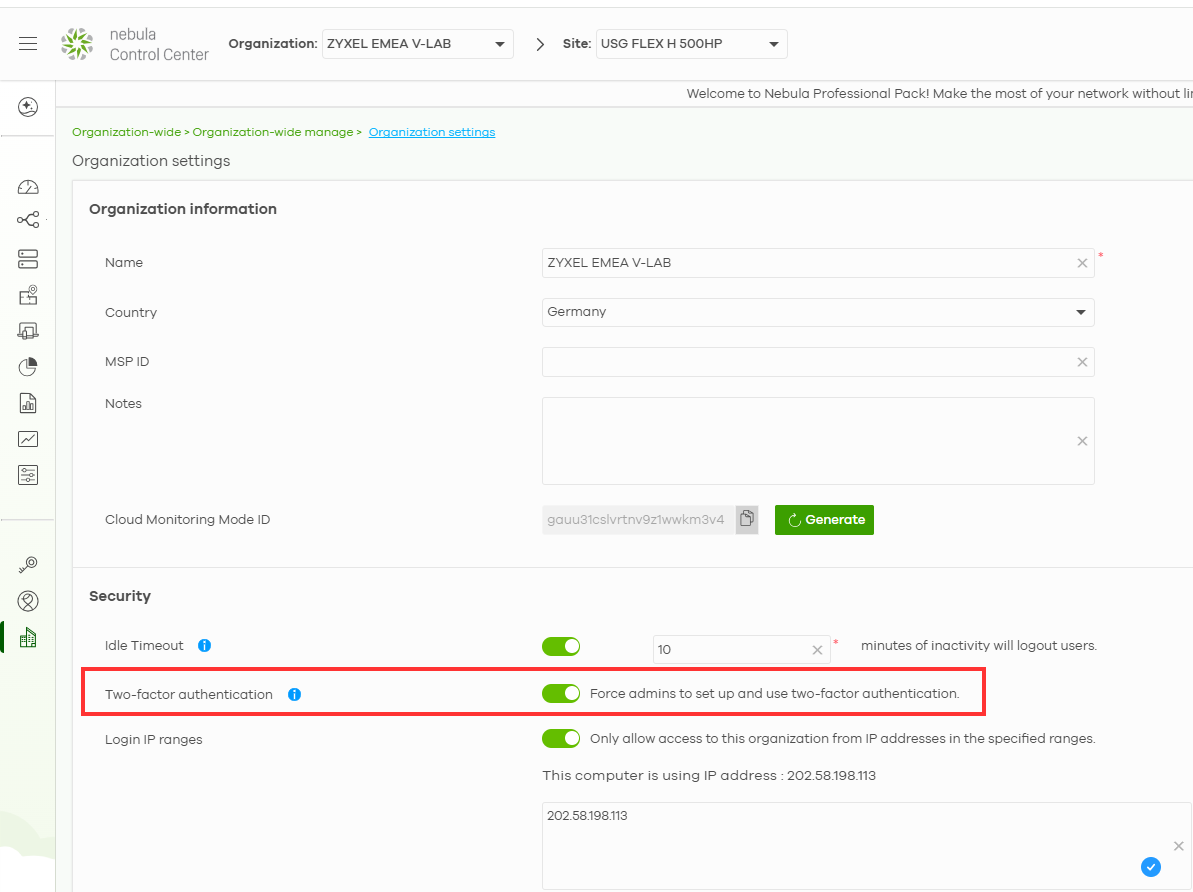 Set up two-factor authentication - Enable and then follow the GUI instructions. Once 2FA is set up, go to your organization in Nebula and activate 2FA.