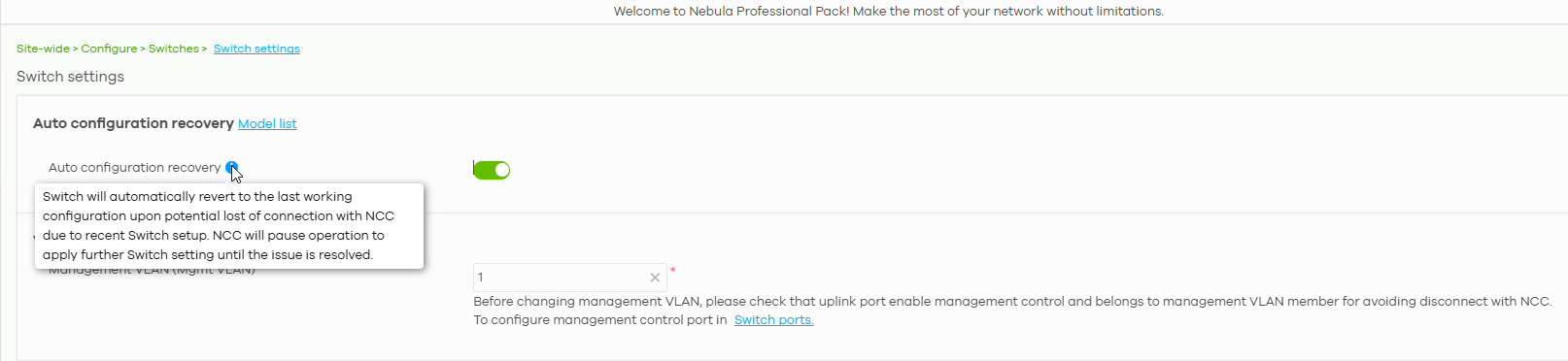 An "Auto Configuration Recovery" message in Nebula typically indicates that a device (in this case, a Nebula-enabled switch) has detected a configuration problem and is attempting to automatically recover or return its configuration to a known, stable state.