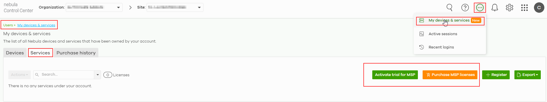 Click the More icon at the top right-hand corner of the Dashboard screen and click the "My devices & services" tab to view the Status of MSP licenses. In this section, you can activate a trial license for 30 days or purchase a full license by clicking on the corresponding button.
