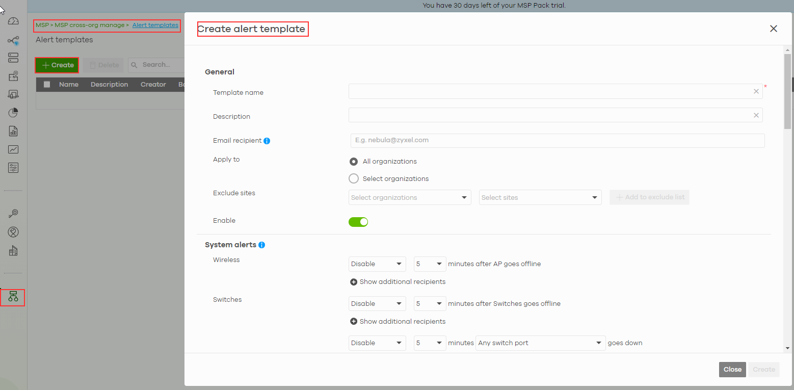 The MSP administrator can configure the MSP alert template to monitor Nebula Devices for unexpected events (for example, online / offline events). NCC’s Smart Alert Engine uses knowledge of network topology and cross-device functionality to only generate alerts for unexpected events. This helps avoids unnecessary emails and notifications.