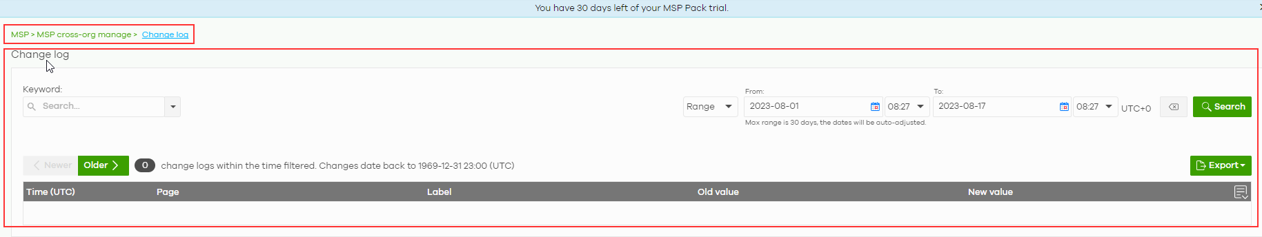 Use the "Change Log" screen to view logged messages for changes in the Admins & teams and Cross-org synchronization screens. When the log is full, it deletes older entries one by one to make room for newer ones.