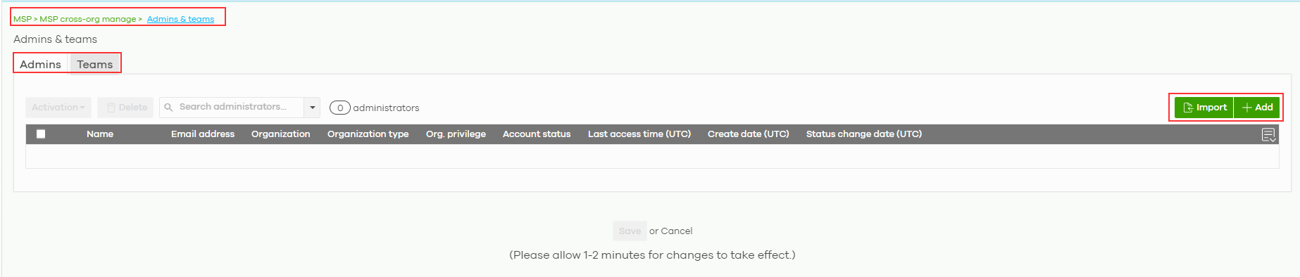 MSP cross-org > MSP cross-org manage > Admins & Teams
