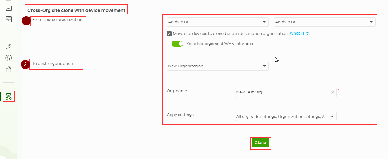 1) "From source organization" - select the Organization where the Site is currently set up. Once the organization is selected, use the Site list to check the Site which settings are needed to be cloned. You might select more than one site if needed