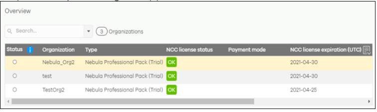 You can also find the organization name, Type (Base/Plus/Pro), NCC license status (licensed or unlicensed), NCC license expiration (UTC) (when license expires), Sites (how many sites), Devices (how many devices), AP (number of APs), SW (number of Switches) Security Appliance (number of firewalls), MR (number of mobile routers).