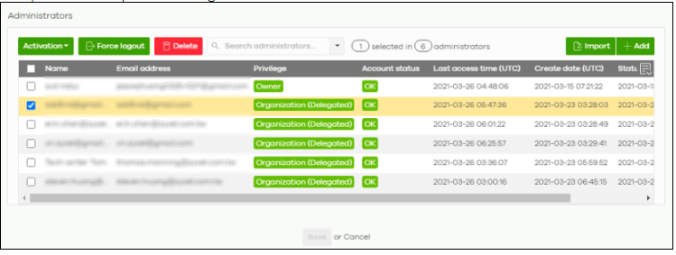 Group Administrator accounts can be added, modified or deleted through this screen. A group administrator has administrator privileges in all organizations in the group.