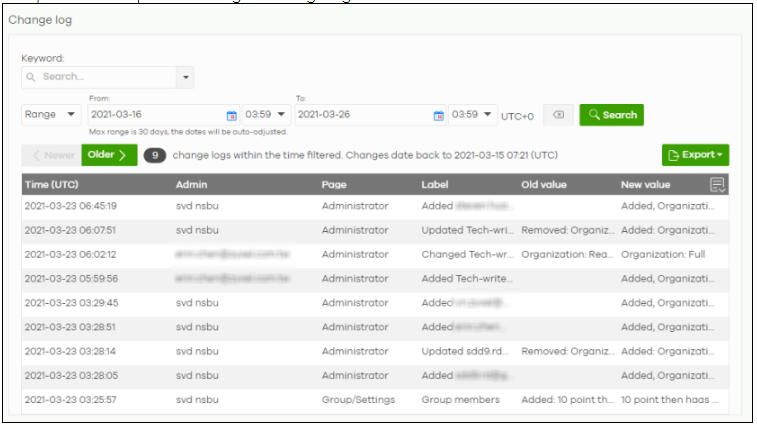 Change log is made for Group administrators to see which admin that did what change in the organizations of a group. It also has a time-stamp for when the change was made.
