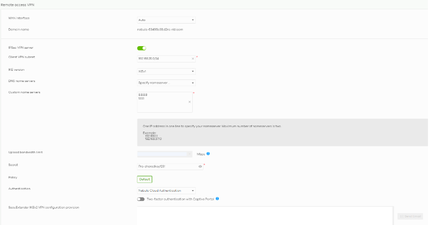 - Password – Provide the NebulaCC VPN account password. Only if "X-Auth Popup" is unchecked.