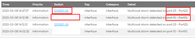 If we go to Switch -> Event Logs, we can see that there is constant multicast storms happening on SW1 (GS1920-24) on port 23 and SW2 (Hidden name) on port 10