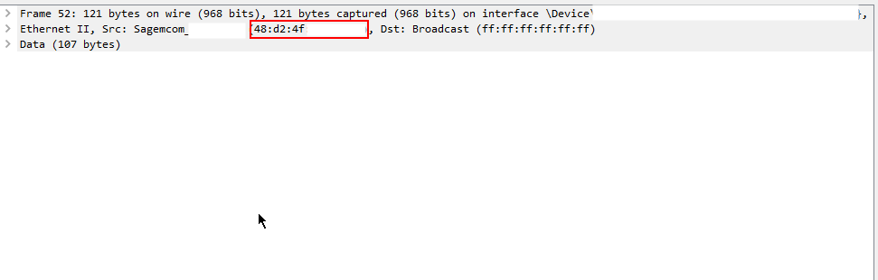 Look at the MAC-address of this device, we can see the MAC address if we mark the broadcast packet from this Sagemcom device and look below the packet capture.