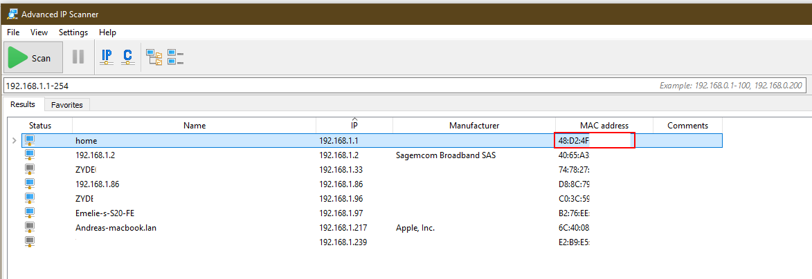 Now, because there was no IP address of this device we found earlier, we will instead open Advanced IP scanner to find out the IP address of that device through the MAC address we found: