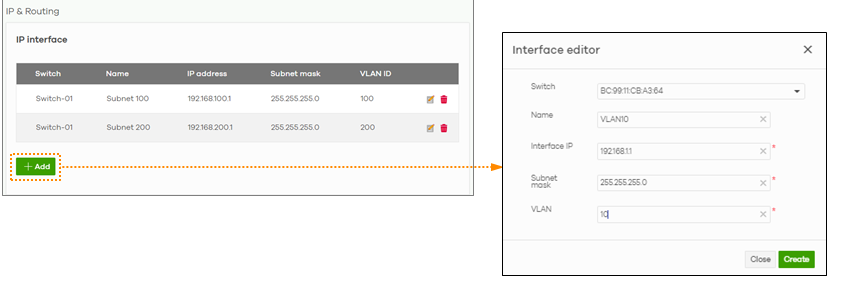 In the "IP interface" section, click add to create a new IP interface on the switch that requires L3 static routes: