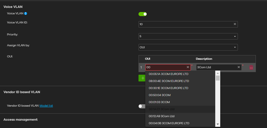 Then configure Voice VLAN settings. Specify the VLAN ID and OUI addresses of the IP phones. OUI are the first 3 bytes (first six digits) of a MAC address that represents the vendor. Through specifying the IP phone MAC address, the switch can identify voice traffic accordingly. Nebula cloud switch supports up to 6 vendor OUIs.