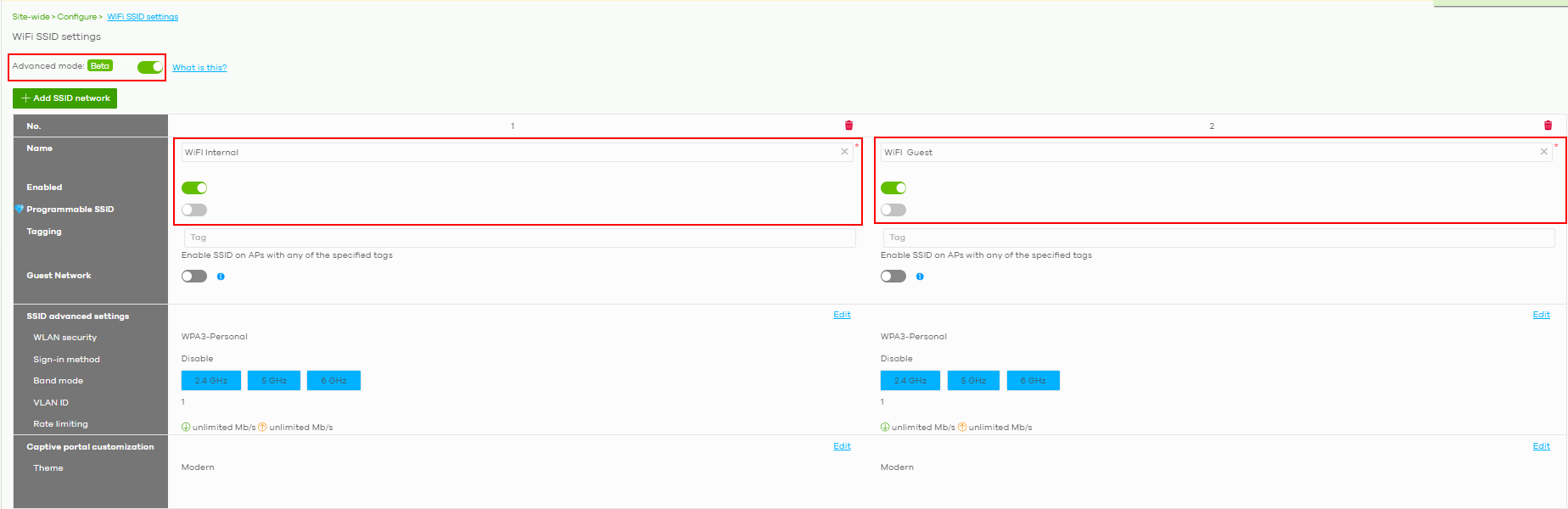 In the "WiFi SSID settings" section possible to configure both WIFI for "internal" users and guest WIFI also. To see all SSIDs options and change their settings, click on Advanced mode: “Show all”