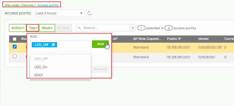 Select via checkbox the APs affected and click on the "Add"-Button left above the table and click on the search bar for "Tag" - it will then show you the option to Tag the Accesspoint either with "LED_On", or "LED_Off". Saving this Option will disable or enable all the LEDs of the AP.