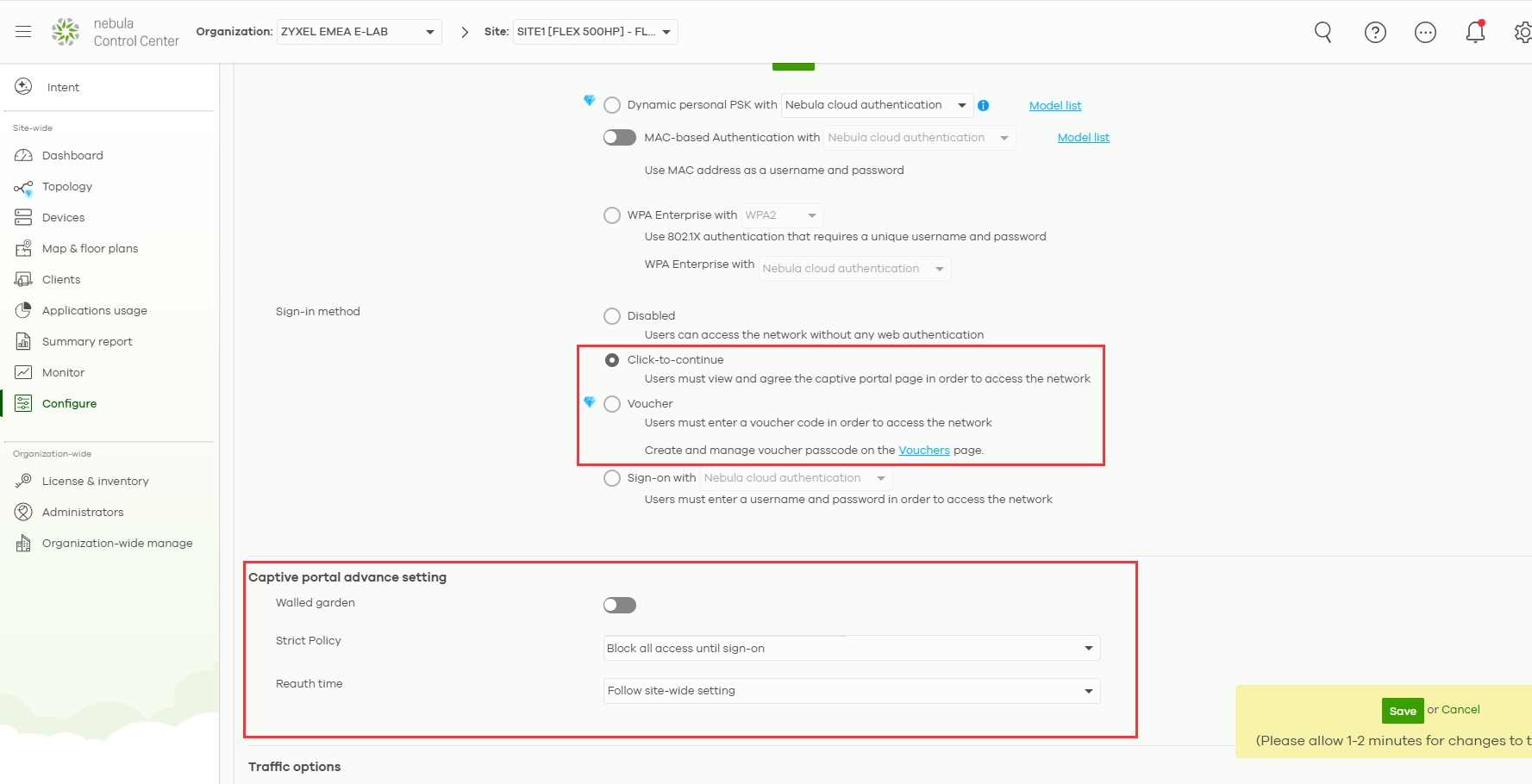 Because we're using "zyxel.com" as our captive portal, we need to re-configure our captive portal settings from "Block all access until sign-on" to "Allow HTTPS traffic without sign-on" because this website is
