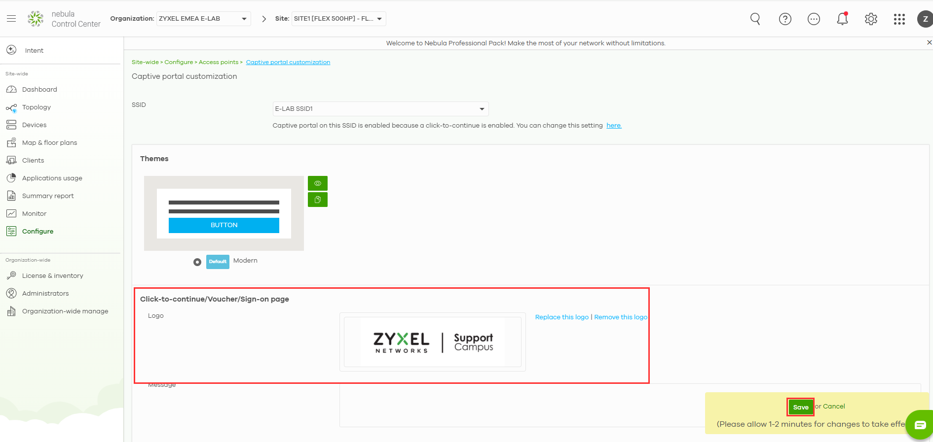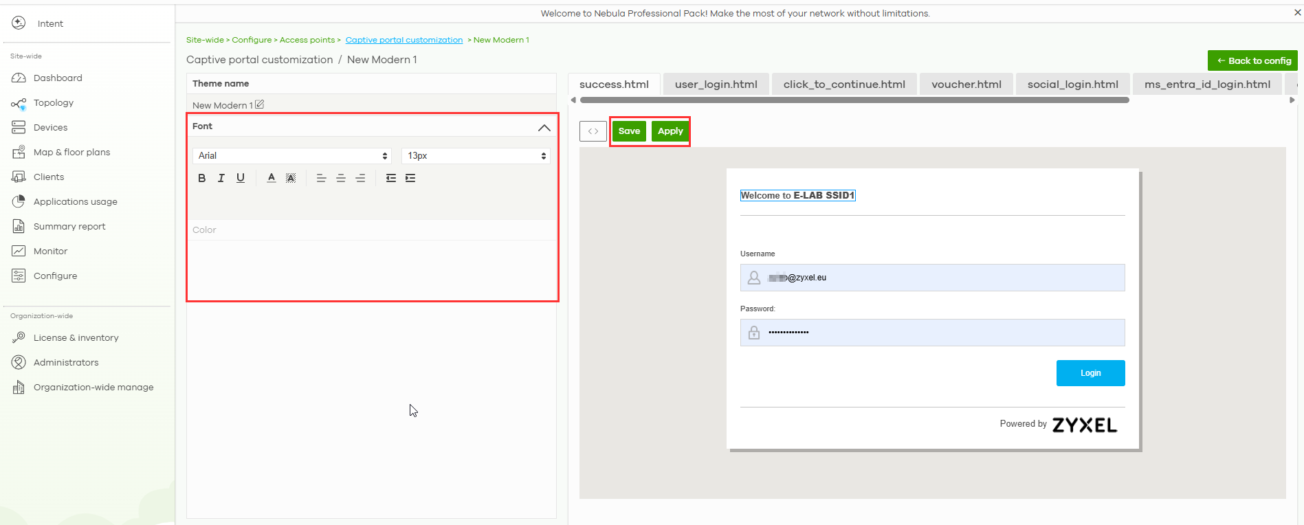 - Navigate to Site-wide -> Configure -> Access points -> Captive Portal Customization