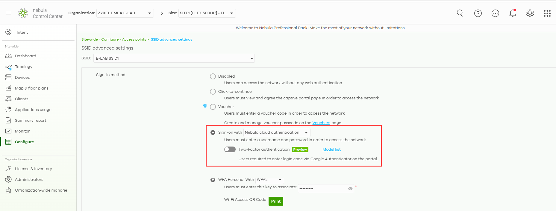 Site-wide -> Configure -> Access points -> SSID advanced SettingsThen select the correct "SSID" and then change the "Sign-in method" to Nebula Cloud Authentication.