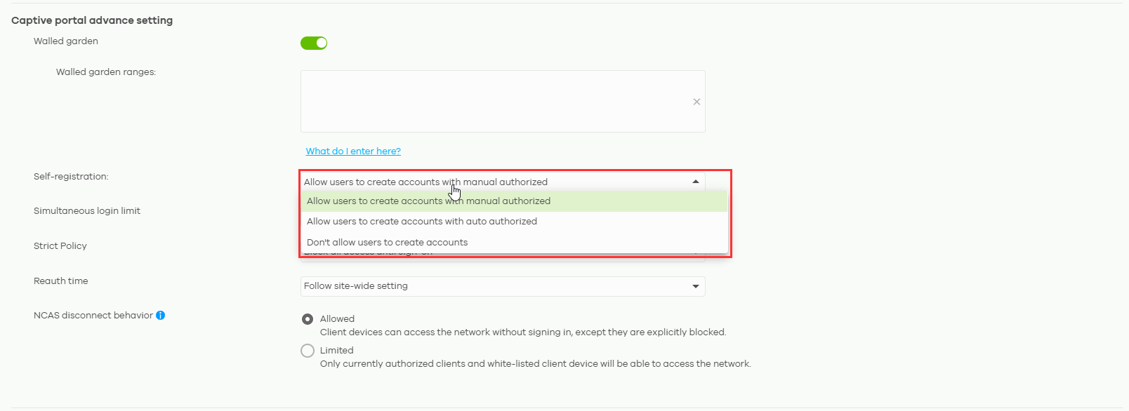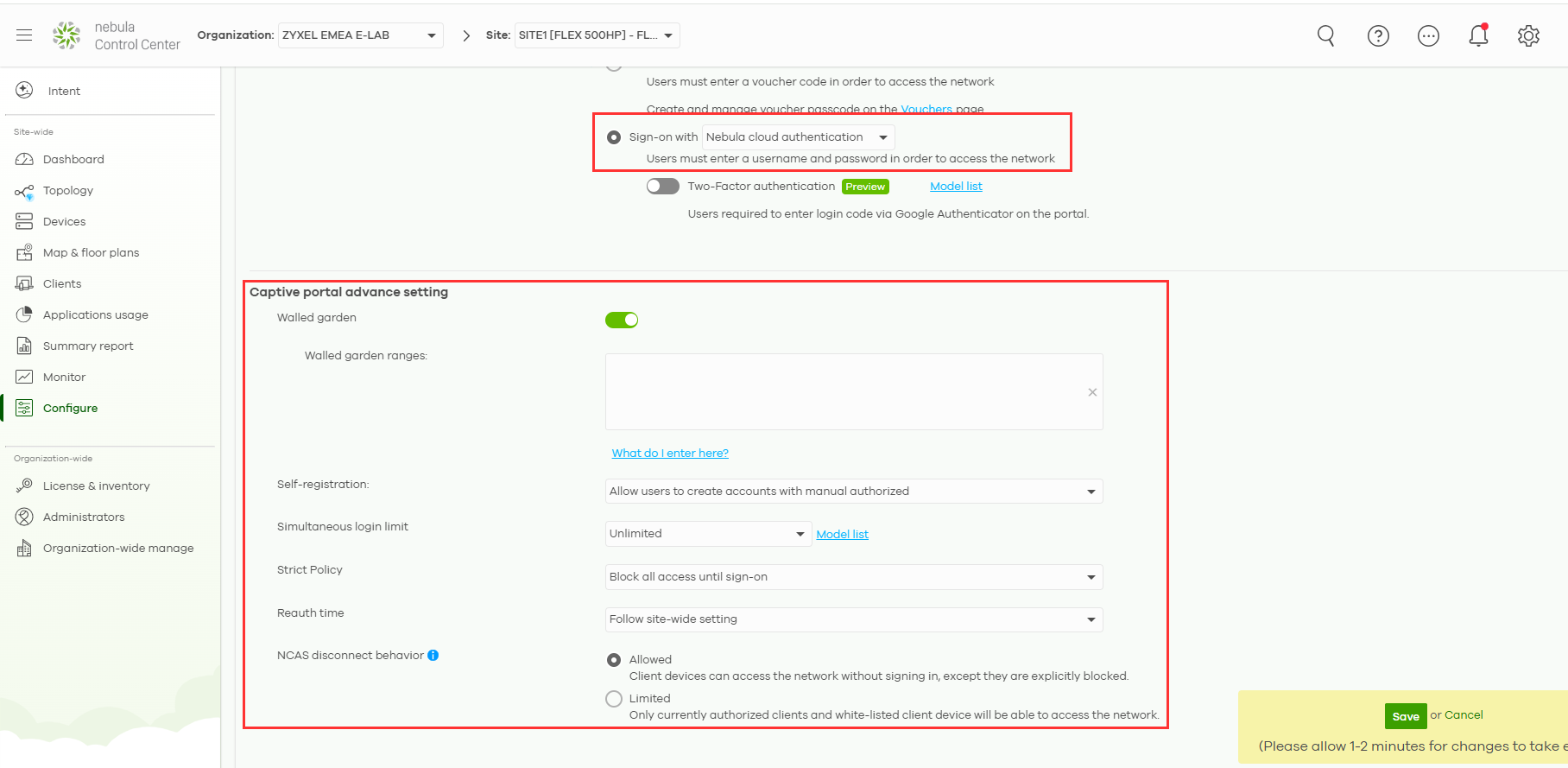 NCAS disconnect behavior - If the Nebula cloud servers are unavailable and the users are not able to authenticate via Captive Portal, choose if you want to allow the users to surf the web anyway, or if they're blocked from the internet until the nebula cloud servers are reachable again.