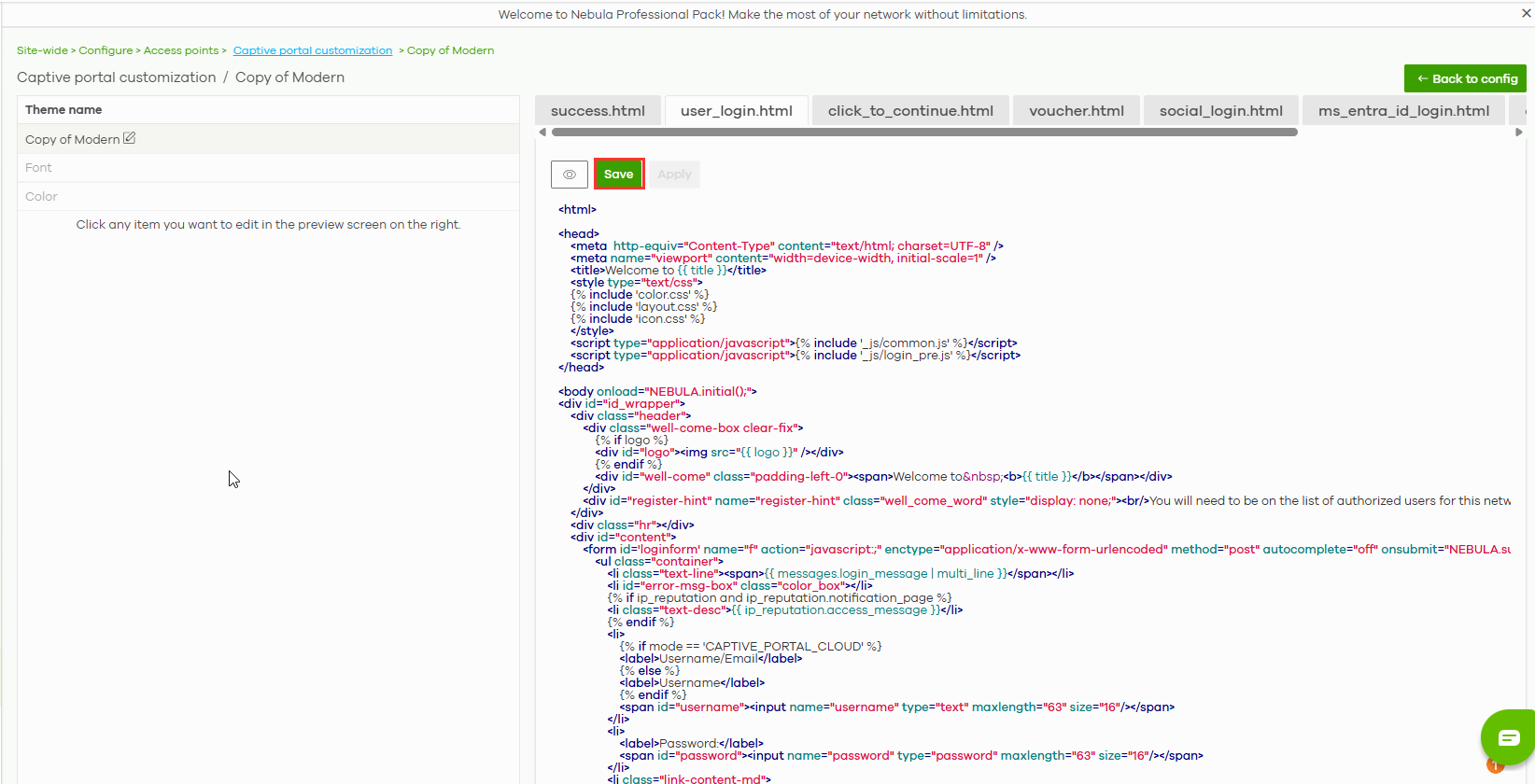 user_login.html,click_to_continue.html,voucher.html, etc.).Click any element in the preview area on the right to modify its content or style.