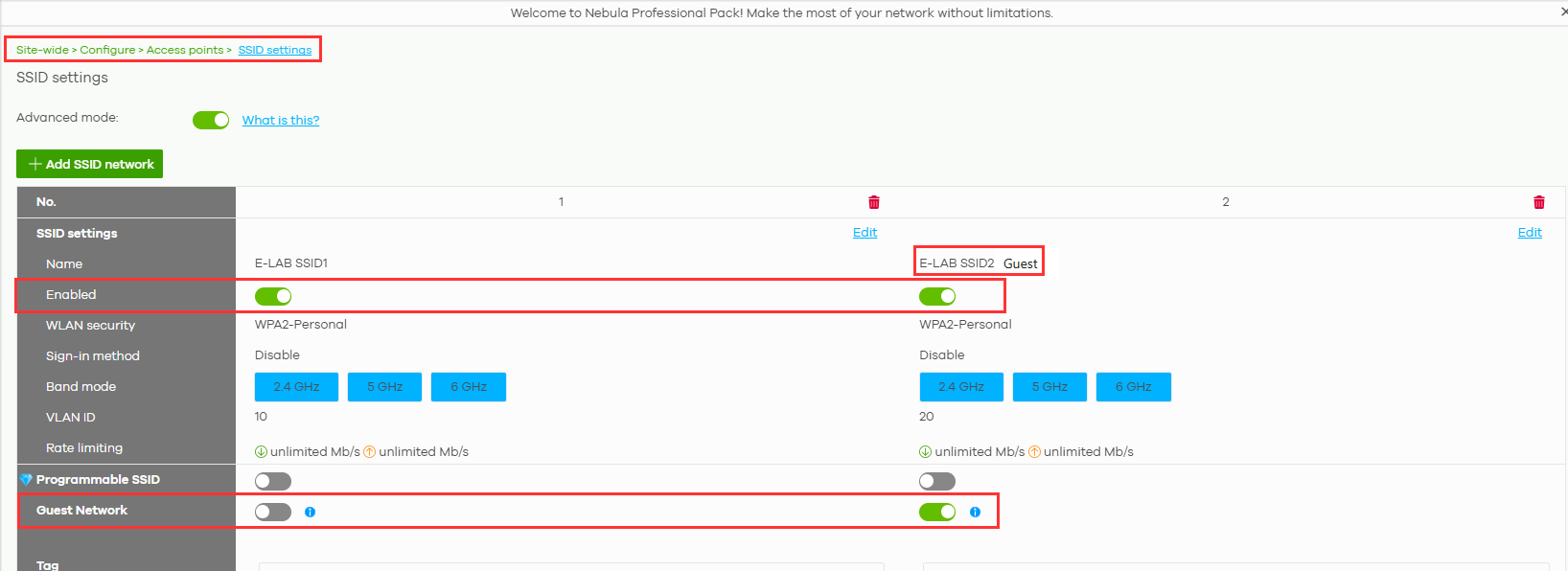 - Then configure your guest SSID by enabling "Advanced mode", so you can see all settings.