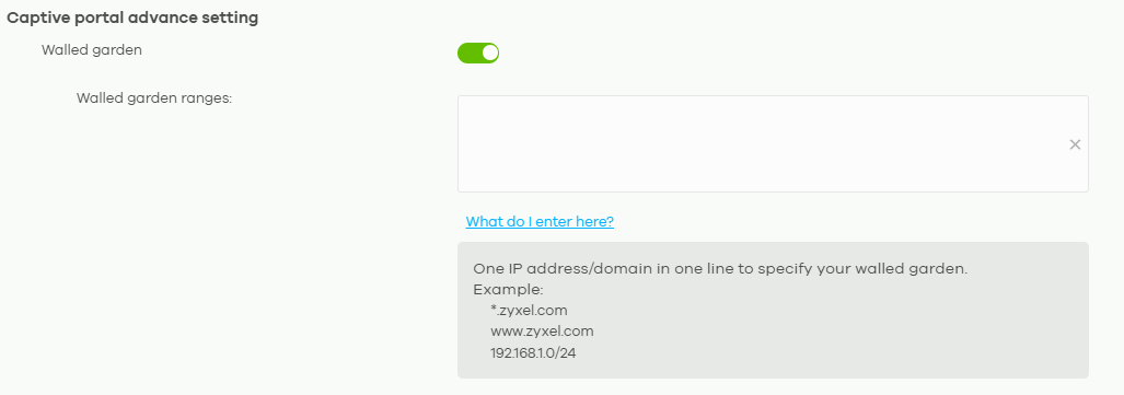 Walled Garden - the "garden" is what websites that the user is allowed to reach without login via Captive Portal (e.g. 192.168.1.34, 192.168.1.0/24, https://zyxel.com). If you have an external Captive Portal, you may enter the website, or IP address of the captive portal