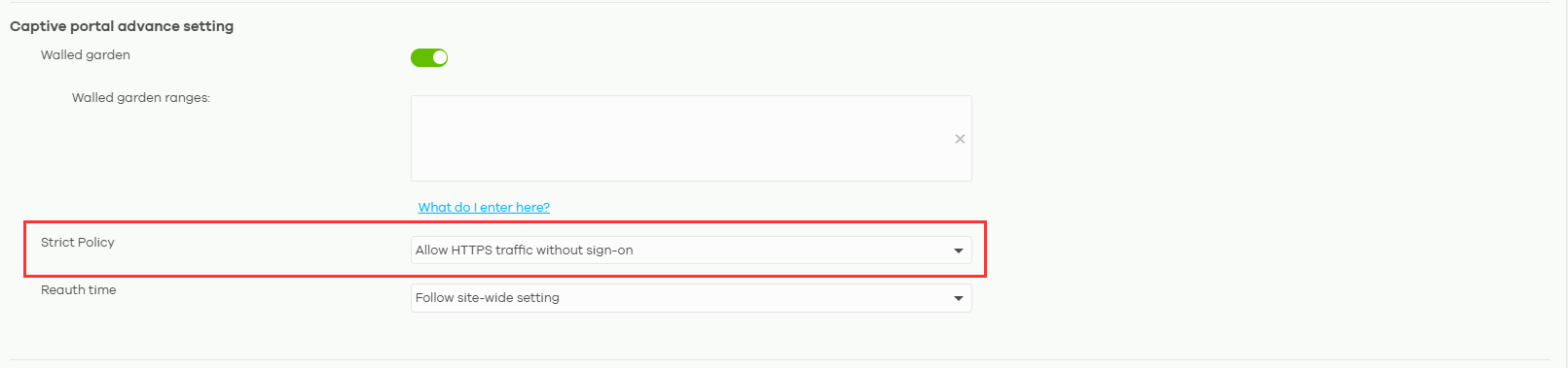 Scrict Policy - Select if users are blocked from internet before Captive Portal authentication, or if they can surf the internet via HTTPS.