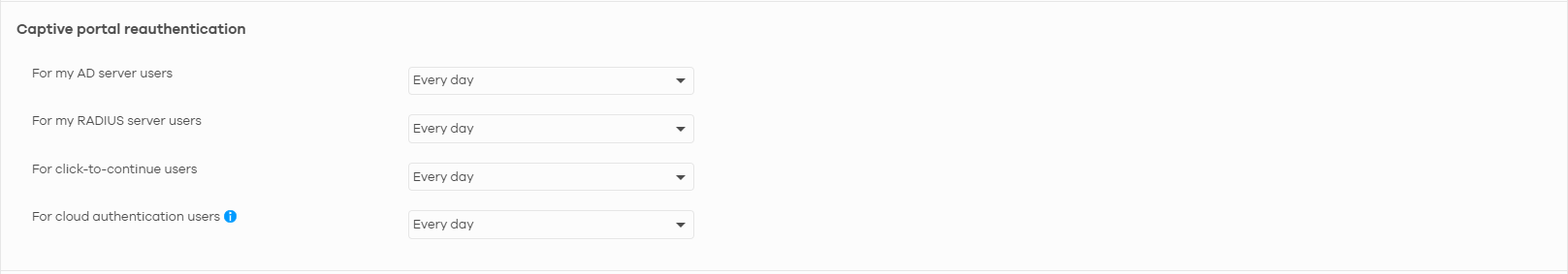 Navigate to "Captive Portal Reauthentication" section and select if you want the users to authenticate every half hour, every day, every 30 days etc.