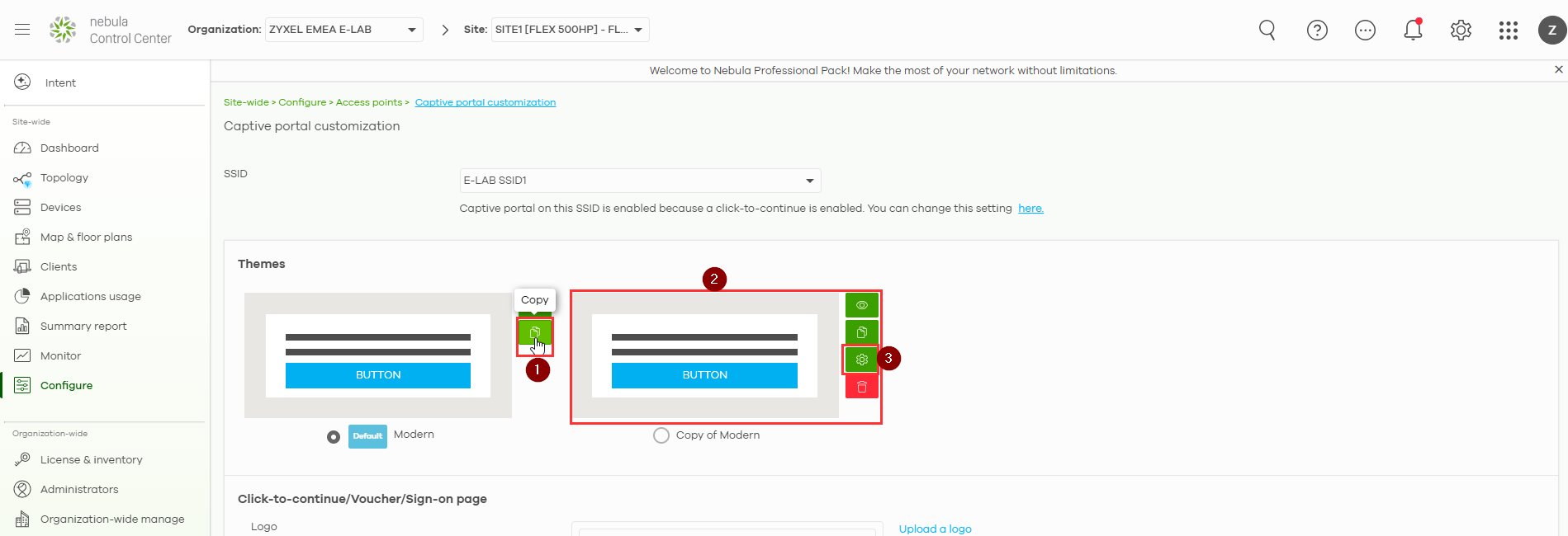 You can customize the whole Captive Portal journey for the users, where you can edit the buttons, fonts, colors and other appearances in the Captive Portal journey. Creating a copy allows you to modify the design without changing the original template. This ensures safe customization, keeps the default version unchanged, and allows you to revert if needed.