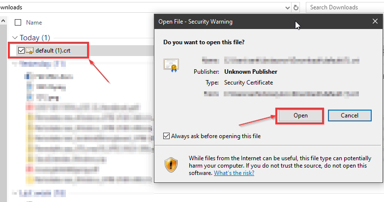 After downloading the certificate file (e.g., default.crt), double-click it.
