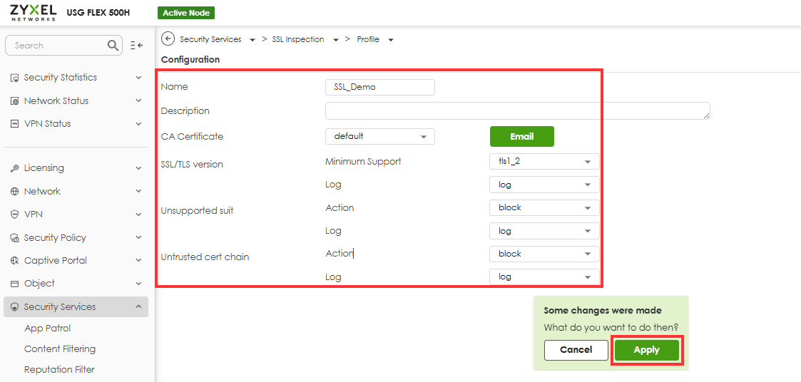 - Select Content Filtering, and SSL Inspection. Click Apply to save.