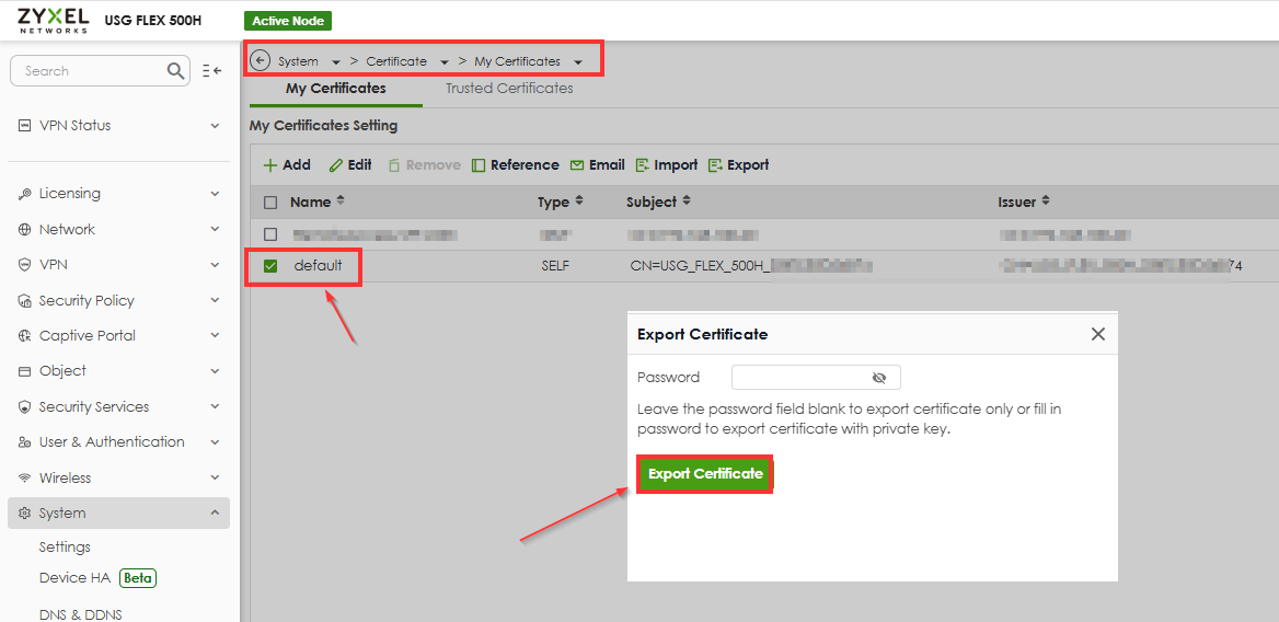 Go to System > Certificate > My Certificates to export the default certificate from USG FLEX H.