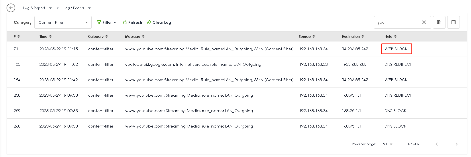 Go to Log & Report > Log/Events and select Content Filtering to check the logs.