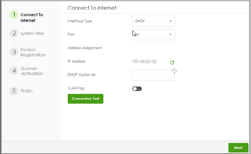 In connecting to the Internet, you can configure a PPPoE connection, DHCP, or a static IP address. However, VLAN tagging configuration may not be available in this step.