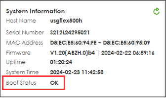 When you turn on a USG FLEX H Series firewall, it goes through a set sequence to set up its configuration files. This sequence helps identify and fix any problems that might come up during startup. The status of the configuration download can also be checked in the web interface of the device, provided that you have access to the web interface of the device.