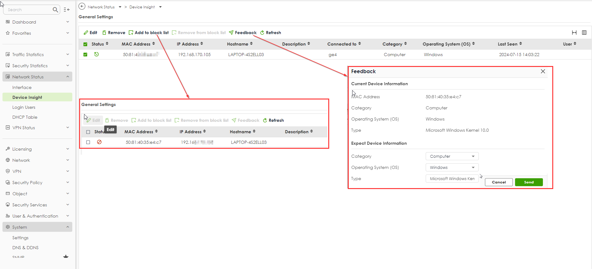 Select an entry and click Feedback to report on a client that is wrongly identified regarding its Category, Operating System or Type