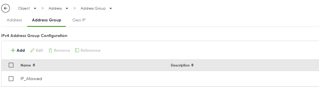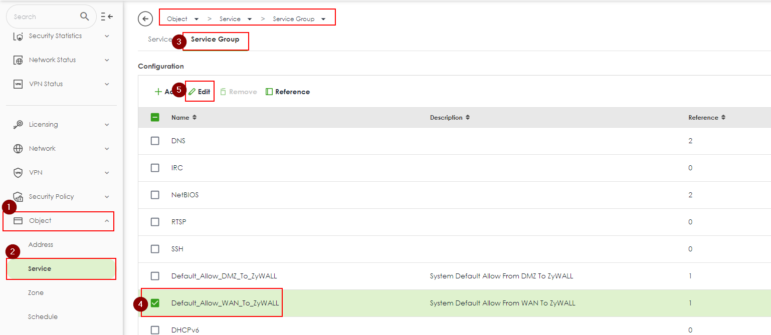 Object > Service > Service Group > Default_Allow_WAN_To_ZyWALL > Edit