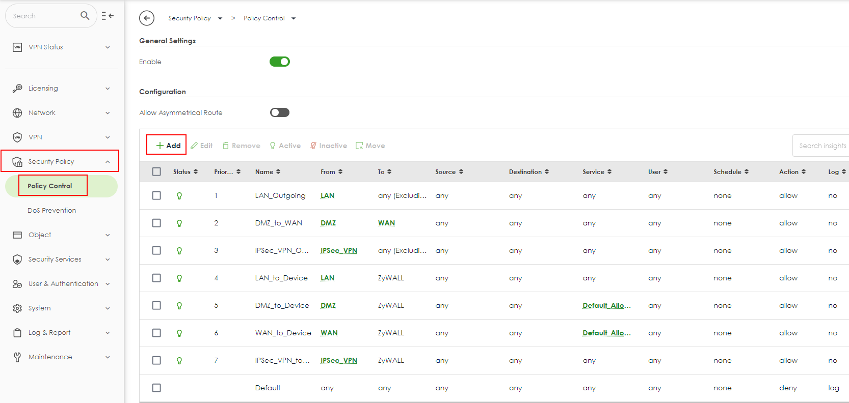 Go to > Security Policy > Policy Control