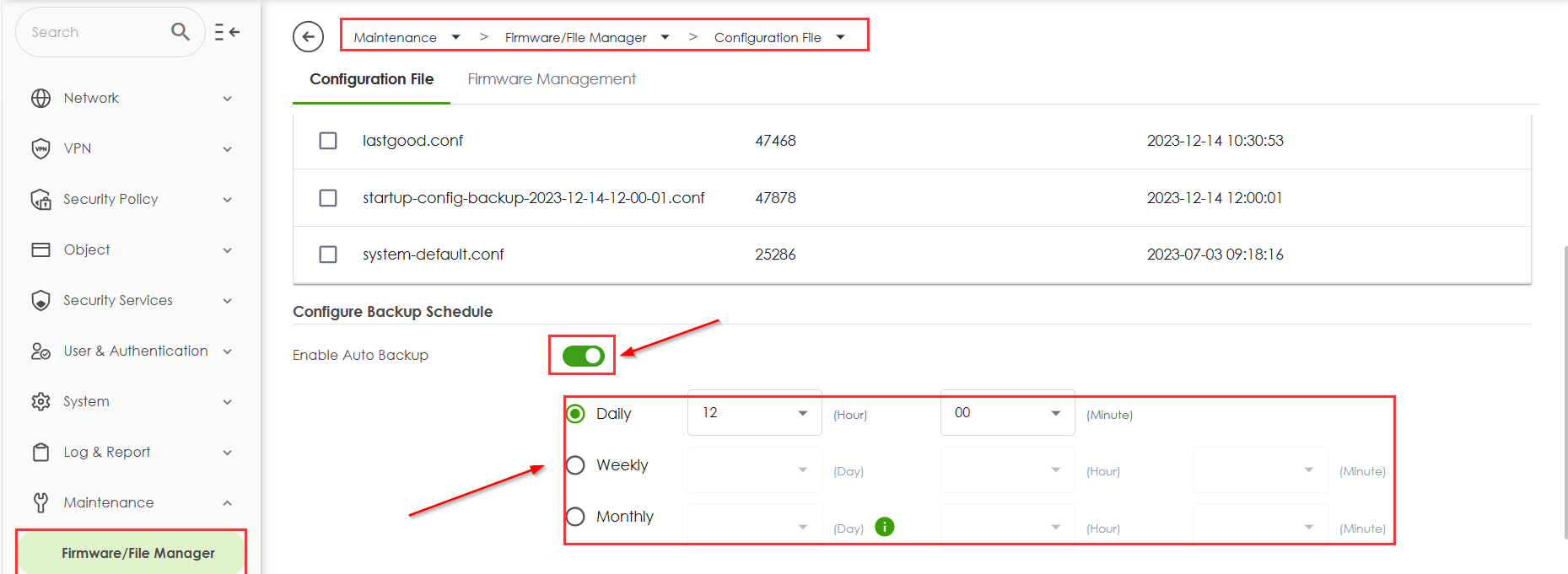 Note: Always keep a backup copy of your configuration so that you can quickly restore your firewall settings if unexpected situations arise during the installation of updates. We strongly recommend making a systematic backup of your device's configuration file.