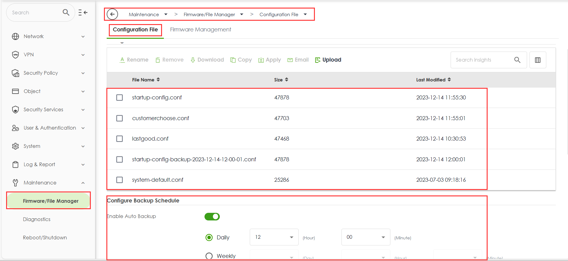 Maintenance -> Firmware/File Manager -> Configuration File