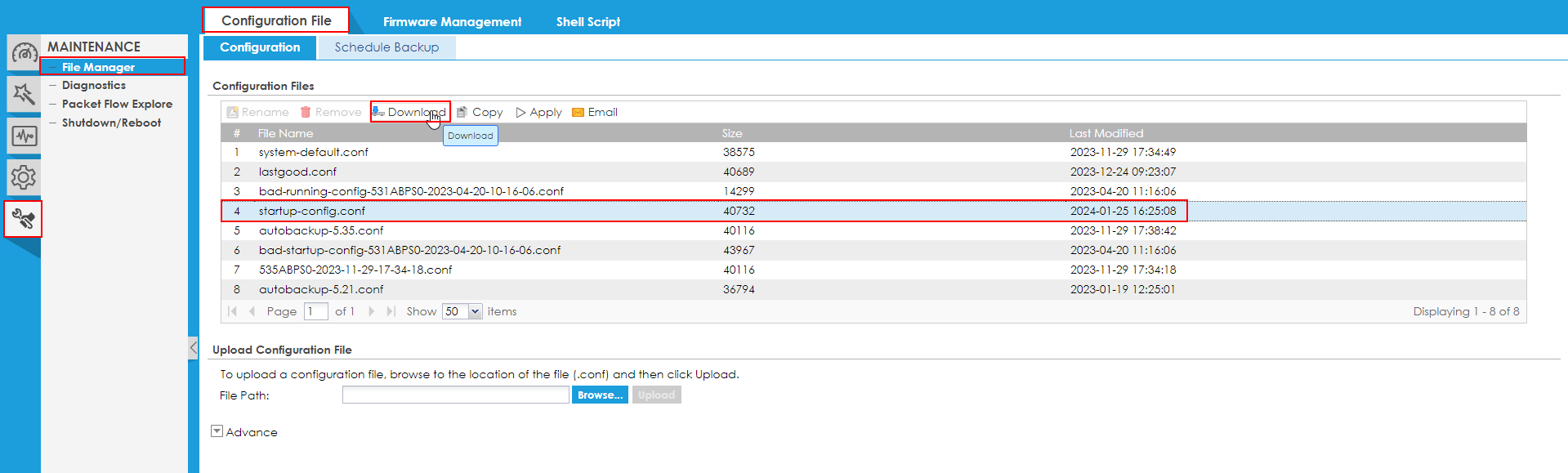 Select startup-config.conf and click on the "Download" button