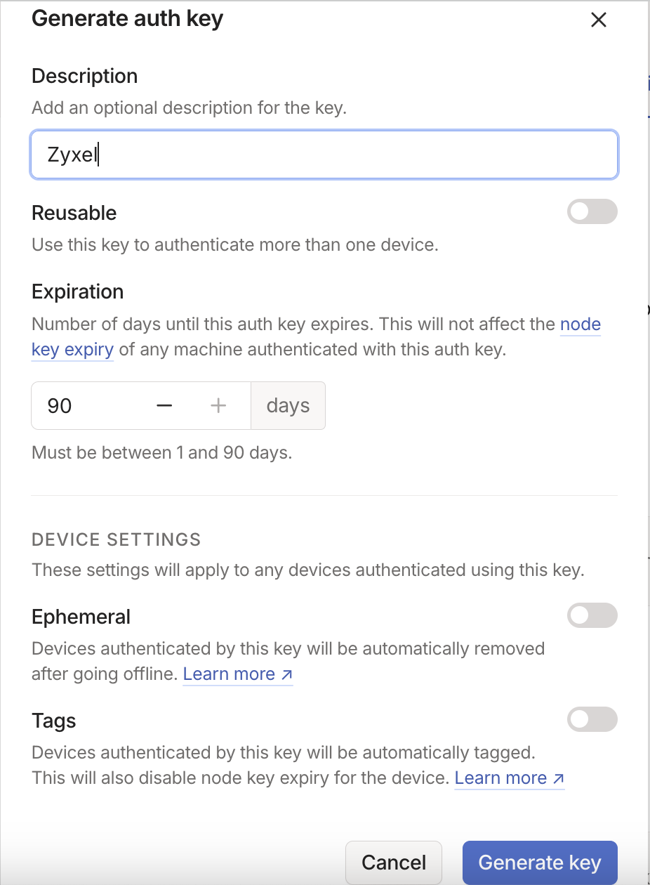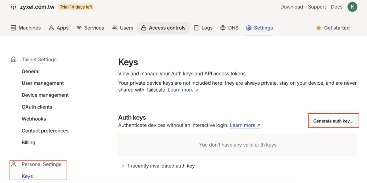 Once signed in, go to Settings → Personal Settings → Keys, and click Generate auth key. This key is used to authenticate your firewall or other devices when joining your Tailscale network.