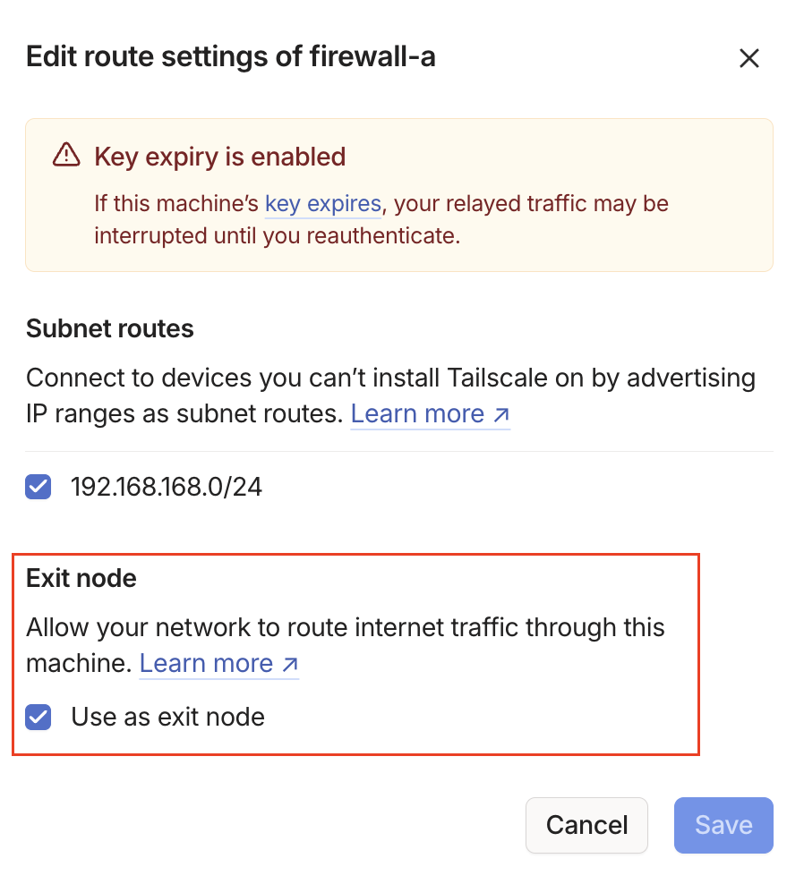 - Take Firewall A as example. Enable “Exit Node” and “Default SNAT”.