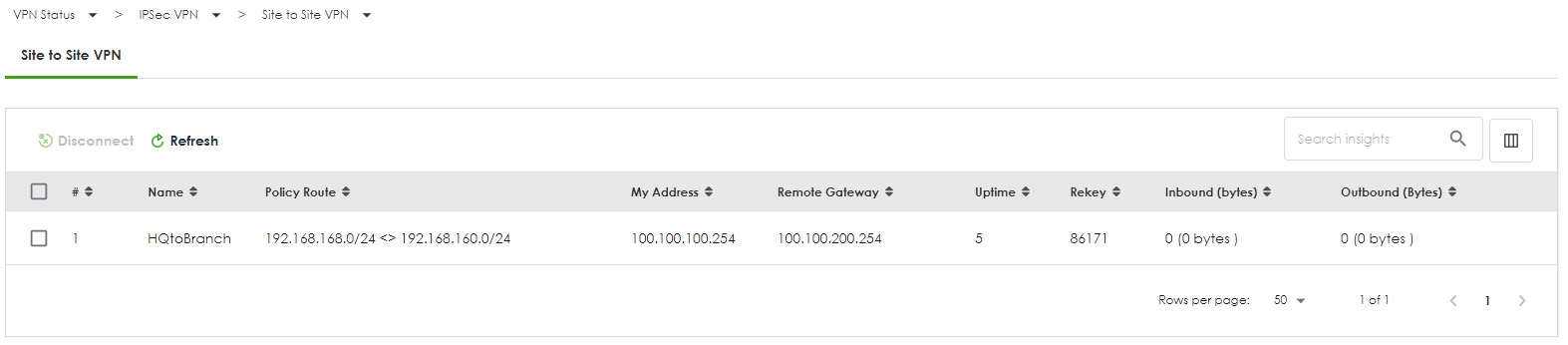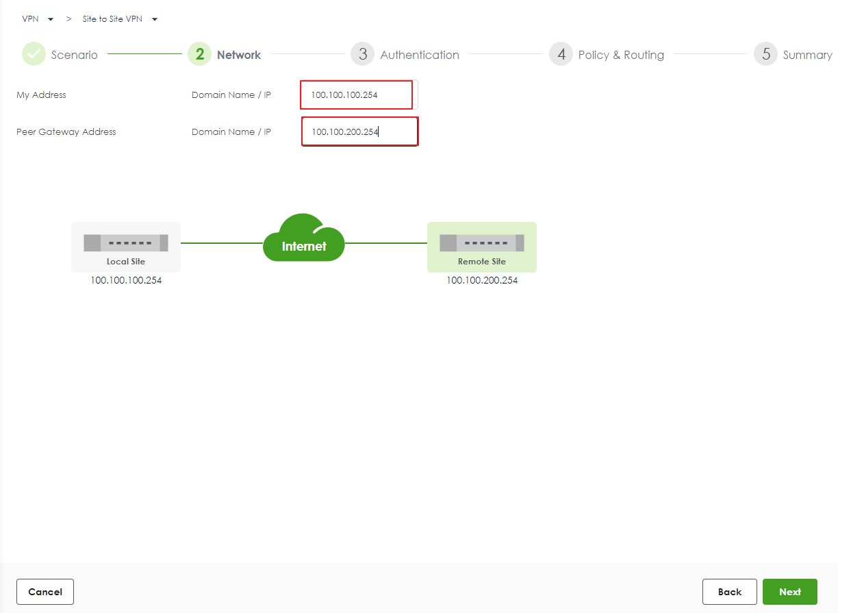 - The "Peer Gateway Address" field specify the address of the remote site "Branch"