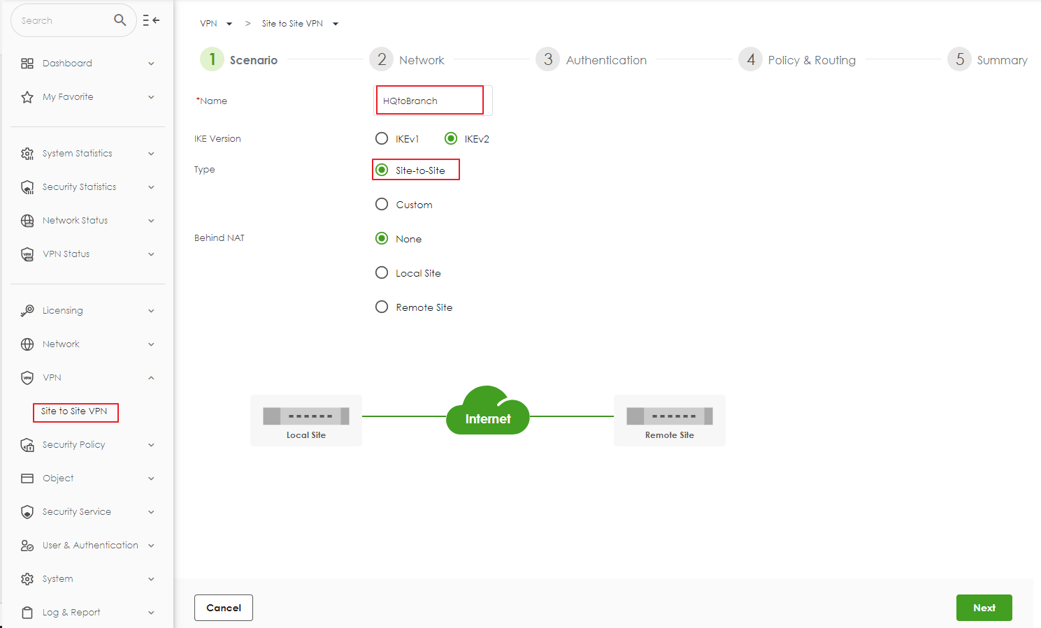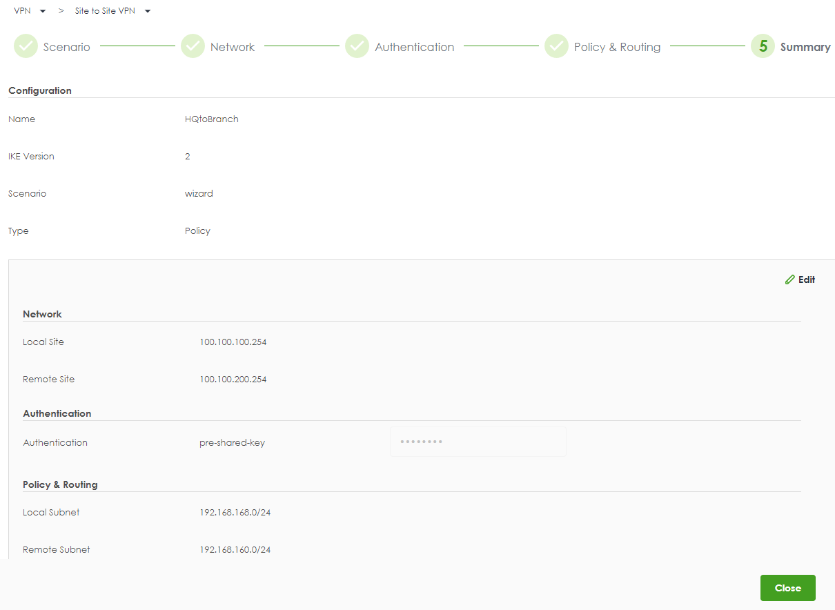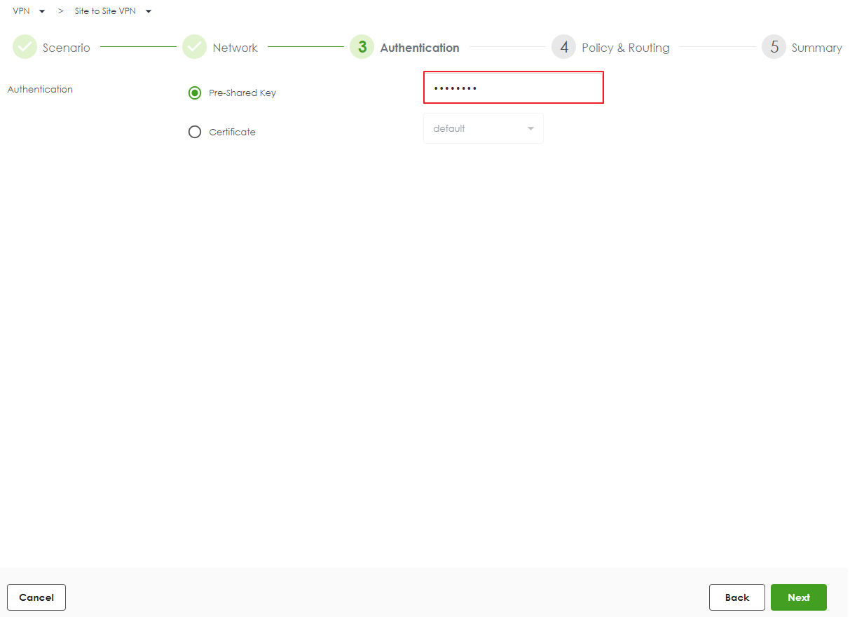 In our example, we use the "Pre Shared Key" authentication method, but certificate authentication is also available.