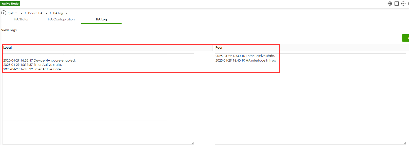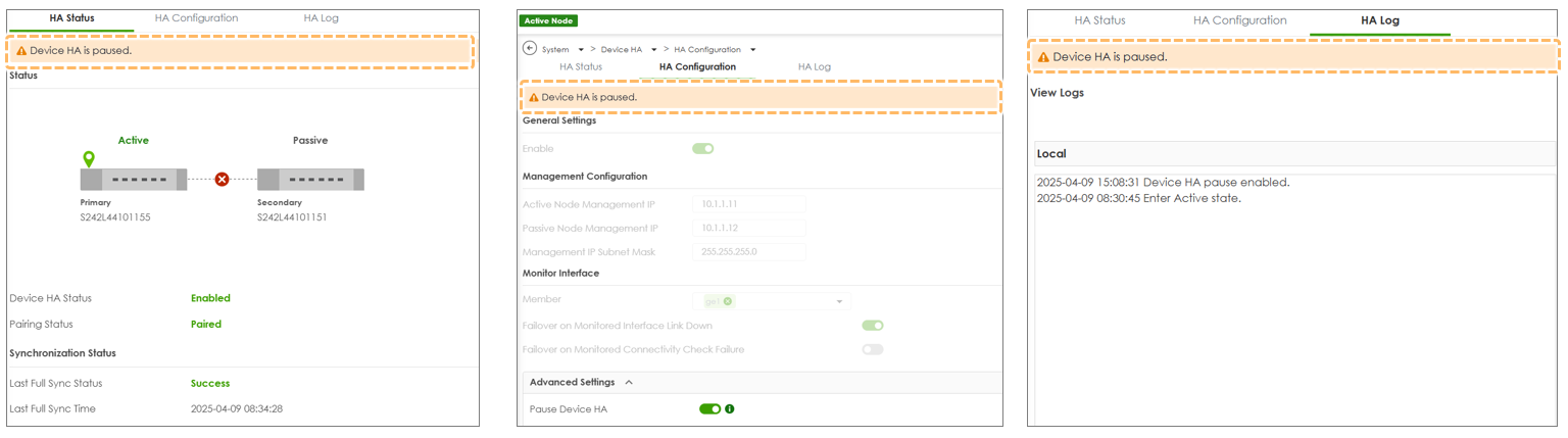 The HA Pause Allow users to pause synchronisation and disable automatic failover during troubleshooting temporarily. The HA Pause function can only be initiated from the active device. Enabling **Pause Device HA** does not unpair the two firewalls; instead, it temporarily suspends monitored interface checks, heartbeat communication, and file synchronisation.
