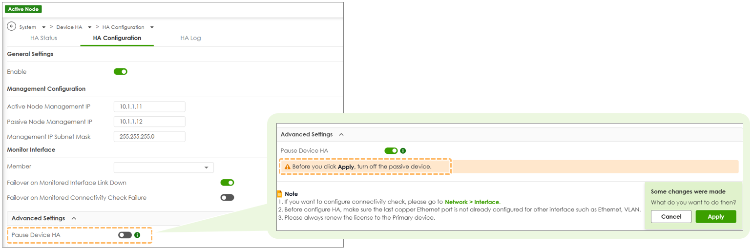 Note: Before you click Apply, turn off the passive device. It is essential to power off the passive device (disconnect it from the power source) before activating "Pause Device HA." Failure to do so may result in both devices becoming active at the same time, potentially causing network conflicts and disruptions.