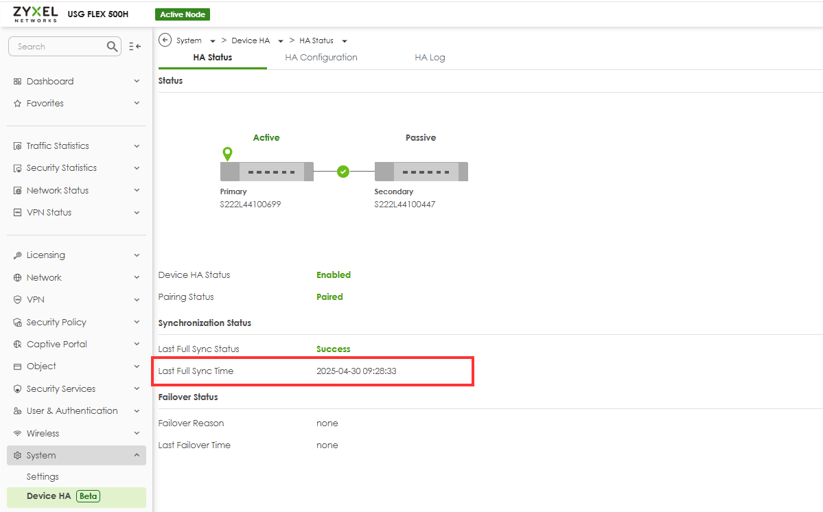 Note: In some cases, after this procedure, any changes made on the active device will continue to be automatically synchronised with the passive device. However, the synchronisation status may not update initially. To resolve this, simply start the synchronisation manually once. After that, the status will update normally.