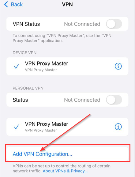 | Now have a verified certificate: | Go to Settings -> VPN & Device | Click "Add VPN" |