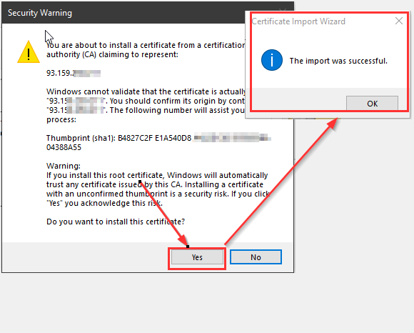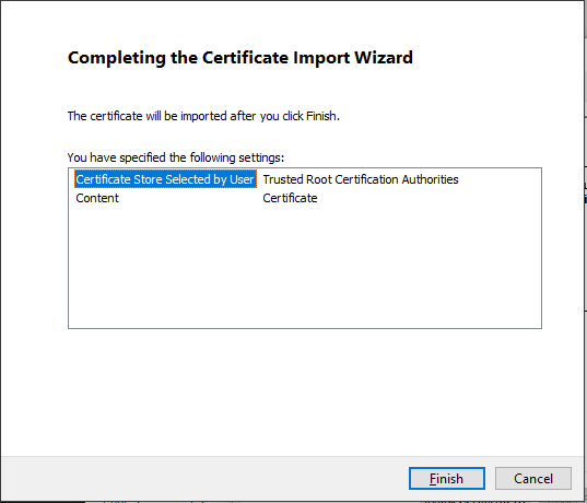 | Select whether the certificate will be available to all users on the computer or only to the current user. | Click "Place all certificates in the following store" and choose "Trusted Root Certification Authorities" |