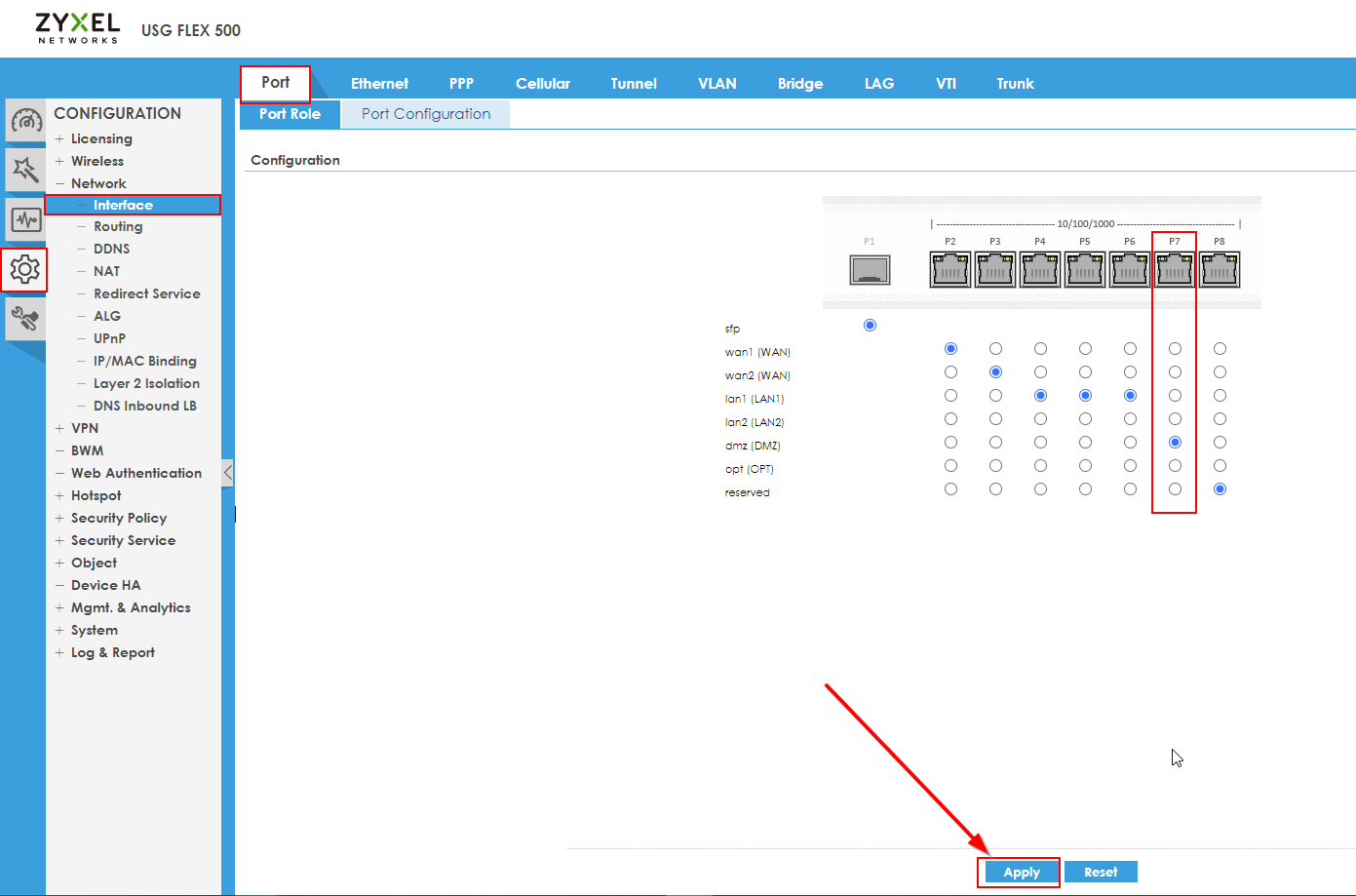 - Check if "DMZ" is assigned to any port, if not it should be assigned. In our case "DMZ" is assigned to "port 7"
